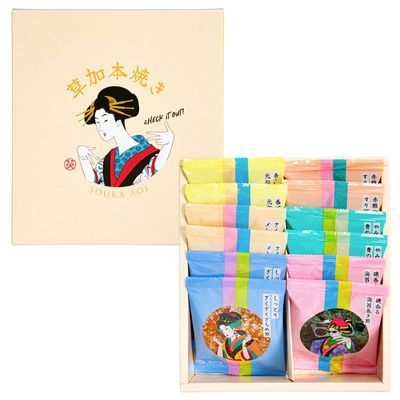 伝統製法で作られた堅めの葵さんの草加本焼きの他、軽くてひと口で食べやすいふっくら寄せ餅や一袋でいろいろな味が楽しめるひとひら彩々、 素材の産地を限定してこだわった海鮮おかき海千楽(うみせんらく)、和と洋のセンスを取り入れ他社にないフレーバーおかき欧千楽(おうせんらく)、米の粒々が感じられる薄焼きパリッと食感の うす揚げつづら餅等、人気のシリーズがそろっています。また、鳴門金時を使った甘さ控えめスイートポテトやもっちりしっとりのお茶請け松ヶ音餅等、 バラエティに富んだ多様な商品があります。すべて個包装、ギフト対応ができますので、お中元、お歳暮、お年賀等の季節のご挨拶の他、お礼の品として、訪問時の手土産等様々な贈りものに活用されています。