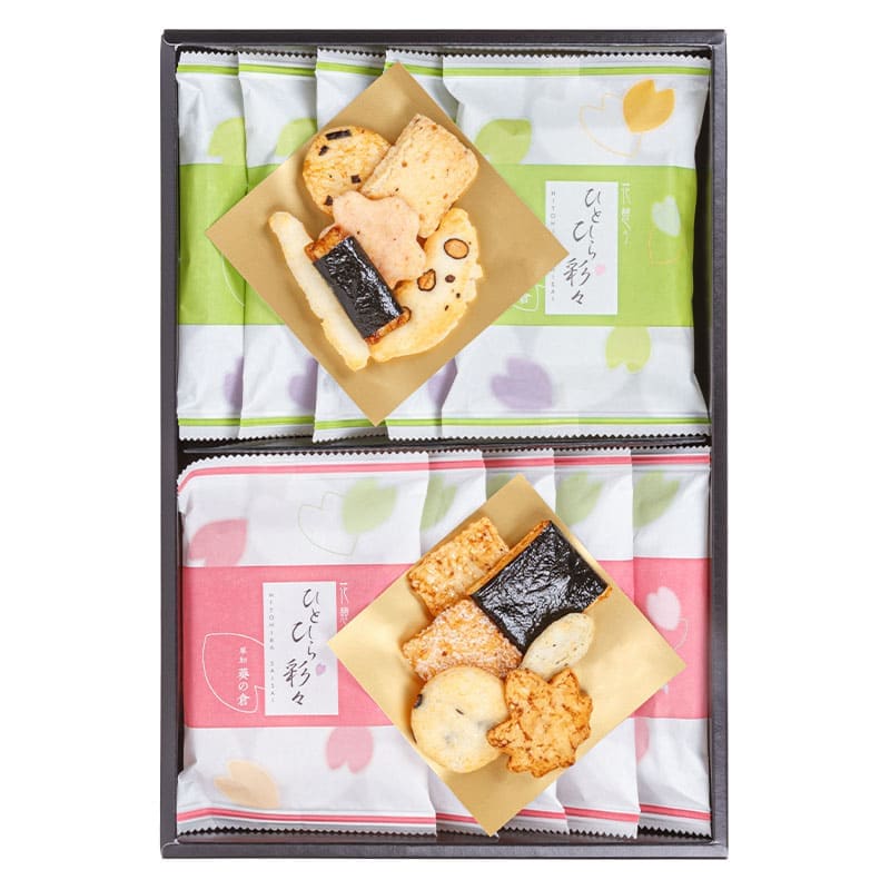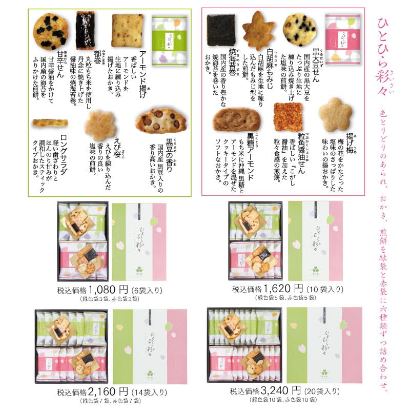 特長ある粋なおかき・煎餅を緑色の袋の中には7種類、赤色の袋の中には6種類を詰め合わせいたしました。