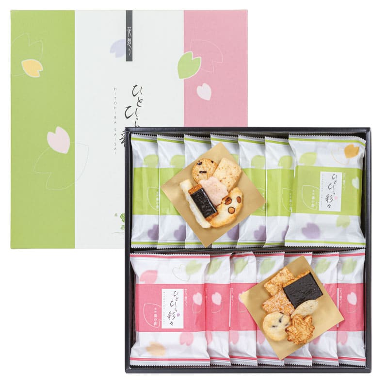 特長ある粋なおかき・煎餅を緑色の袋の中には7種類、赤色の袋の中には6種類を詰め合わせいたしました。