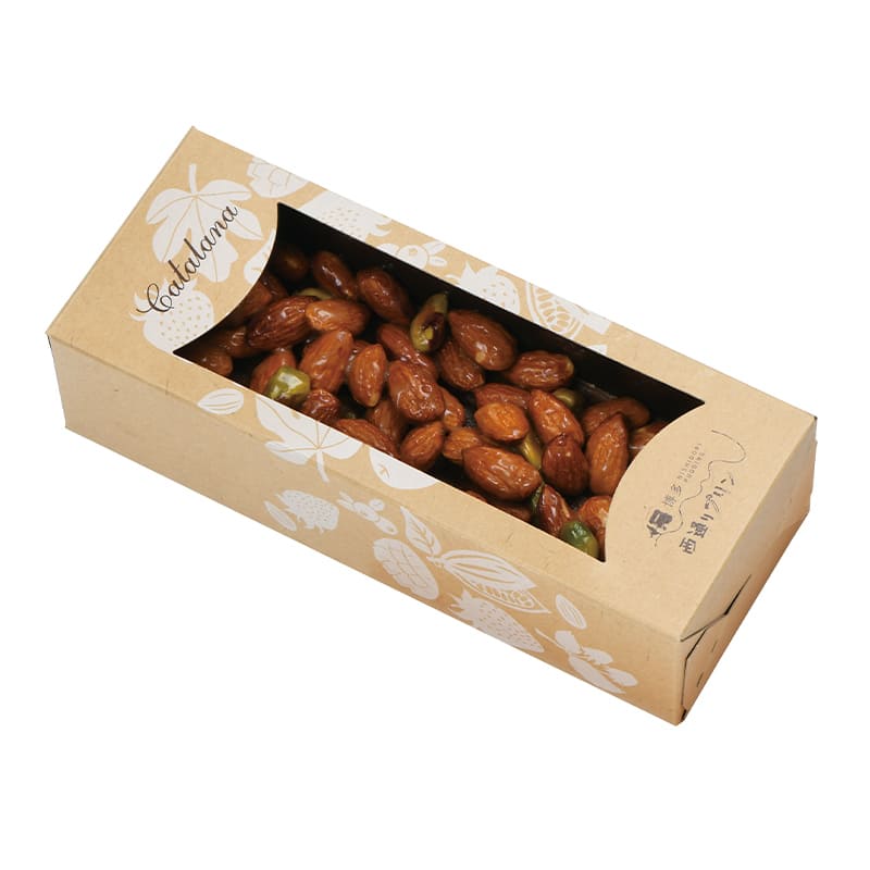 牛乳(国内製造)、アーモンド、乳製品、グラニュー糖、液卵黄、チヨコレート、液卵白、乳等を主要原料とする食品、ピスタチオ、寒天加工品、はちみつ、食塩/乳化剤、香料、酸化防止剤(V.E)、(一部に乳成分、卵、大豆、アーモンドを含む)