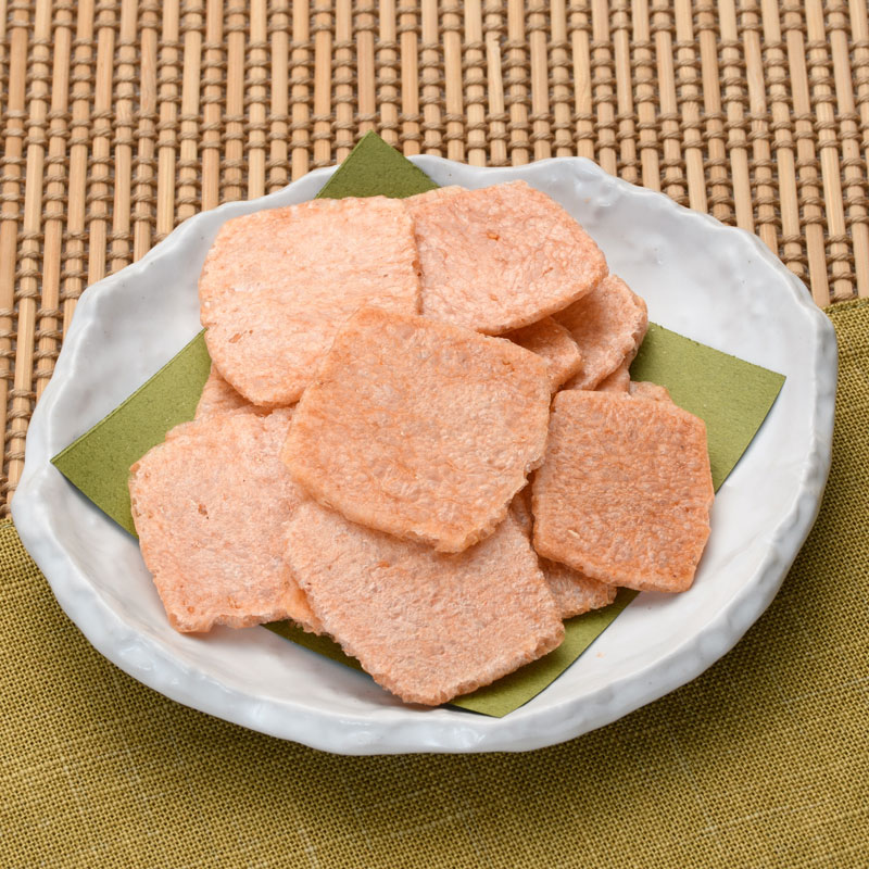 旨味を含んだ有頭海老を丸ごとミンチにしてイカ・オキアミと練りこみました。薄焼きの一口サイズで海老の旨味を味わえます。