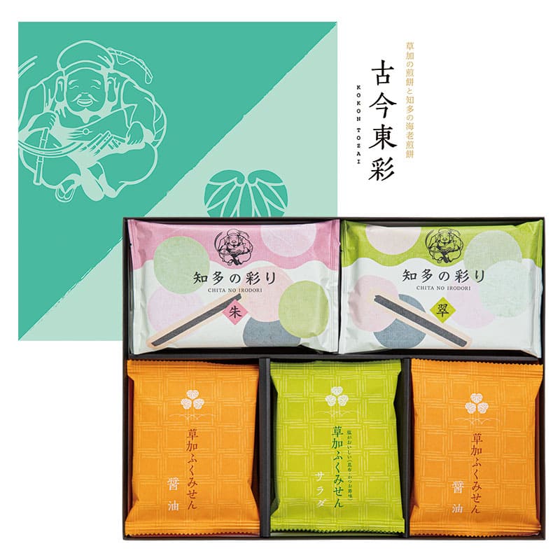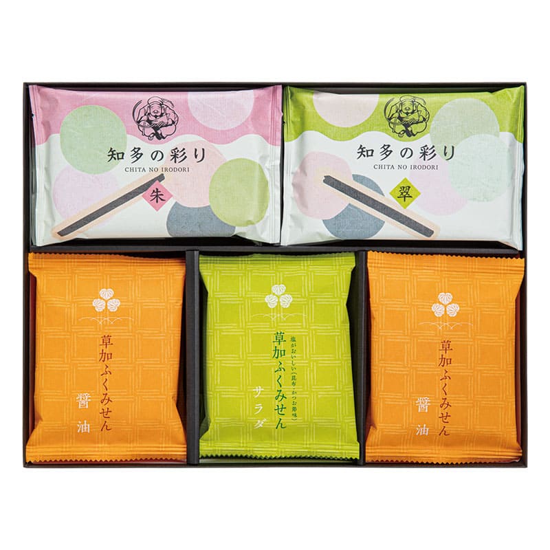 | 商品内容 | 【草加ふくみ煎】醤油×6袋、 サラダ×3袋、 【知多の彩り】翠色袋(8個入)・朱色袋(8個入)×各3袋 |