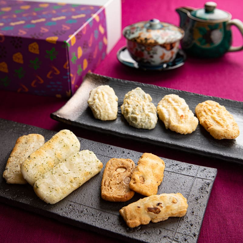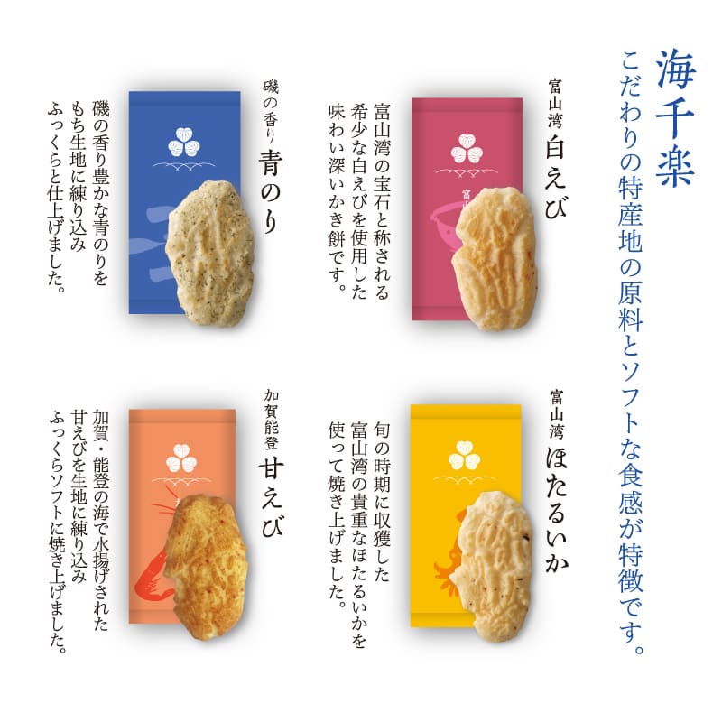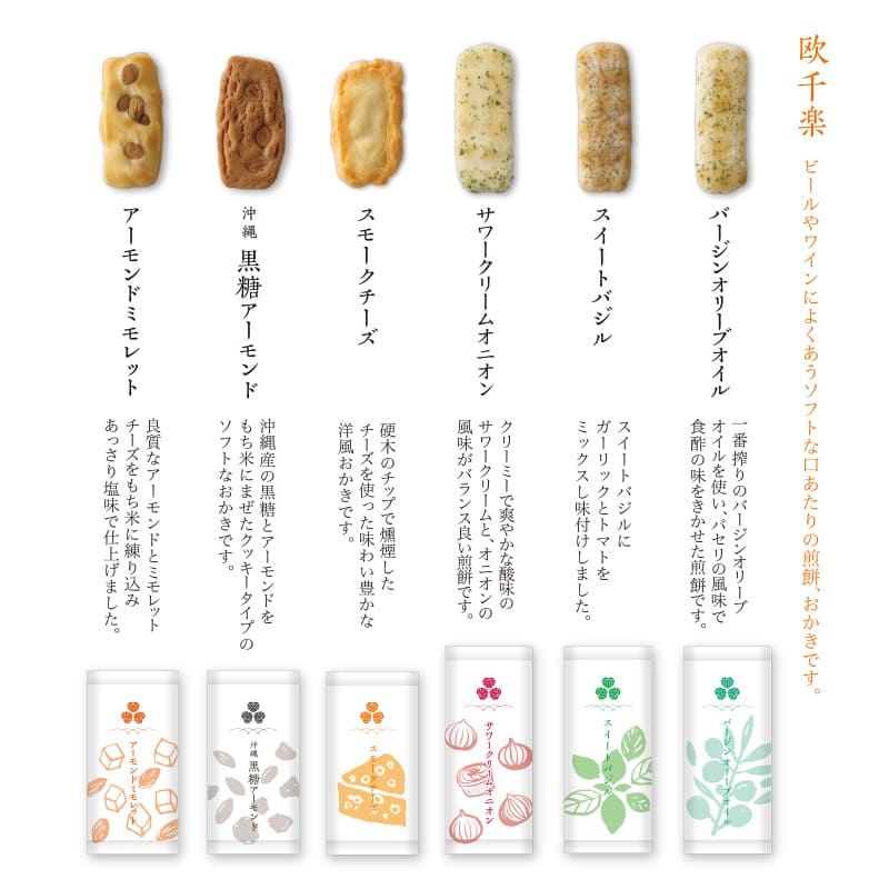 こだわりの特産地の原料を使用した海鮮おかきとビールやワインにもよくあうソフトな口当たりの洋風煎餅、おかきです。特徴のある商品を詰合せました。