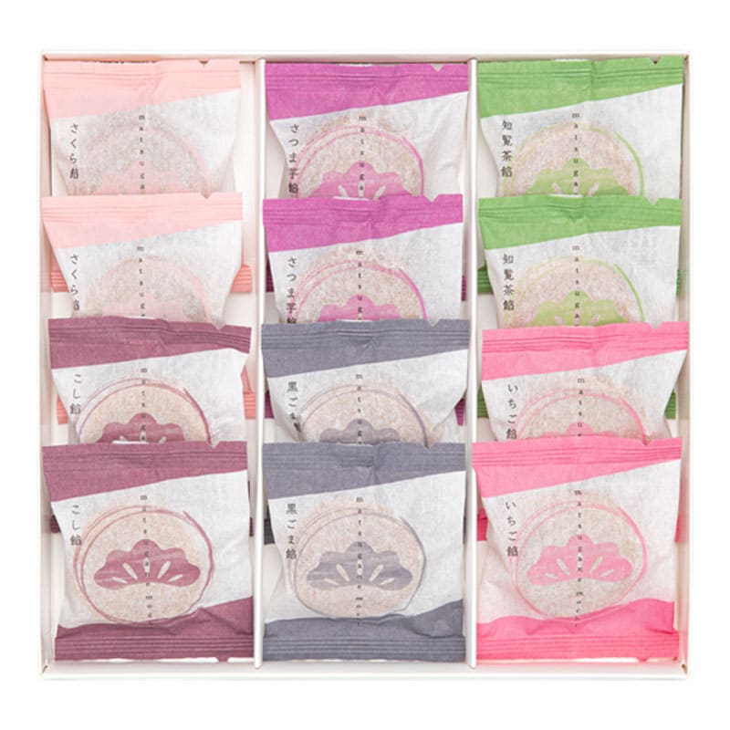 | 商品内容 | こし餡・黒ごま餡・いちご餡・さくら餡・知覧茶餡・さつま芋餡×各2個 |