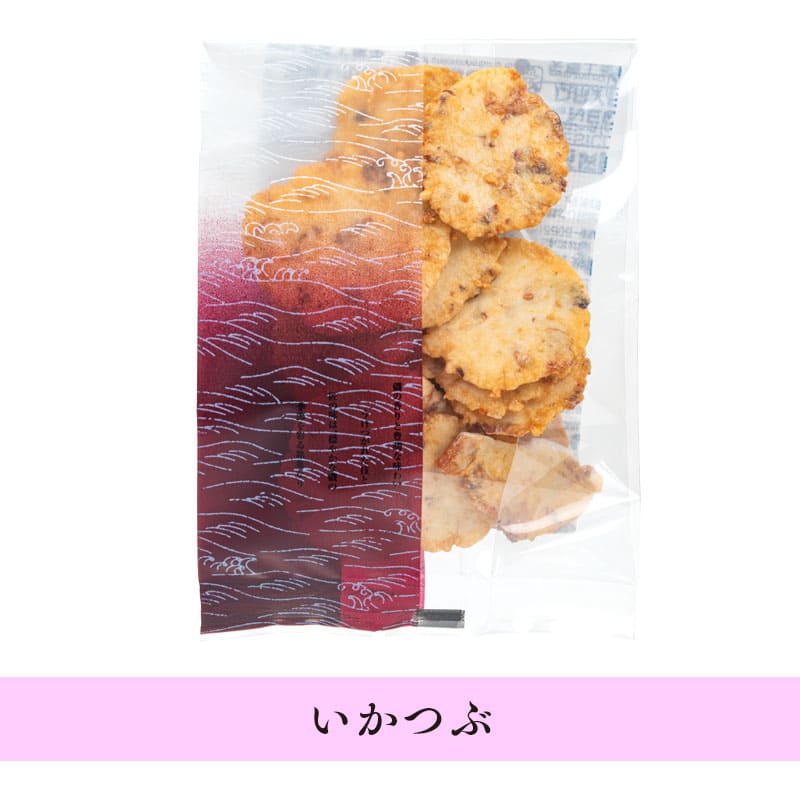 | 原材料名 | 澱粉(国内製造)、えび、砂糖、いか、しょうゆ加工品、植物油、オキアミ、たん白加水分解物、水飴、食塩、小麦粉、あおさ、風味調味料、のり、唐辛子、しょうが、酵母エキス/加工澱粉、調味料(アミノ酸等)、乳化剤、紅麹色素、甘味料(ステビア、甘草)、酸味料、Ph調整剤、(一部にえび・小麦・乳成分・いか・大豆を含む) |