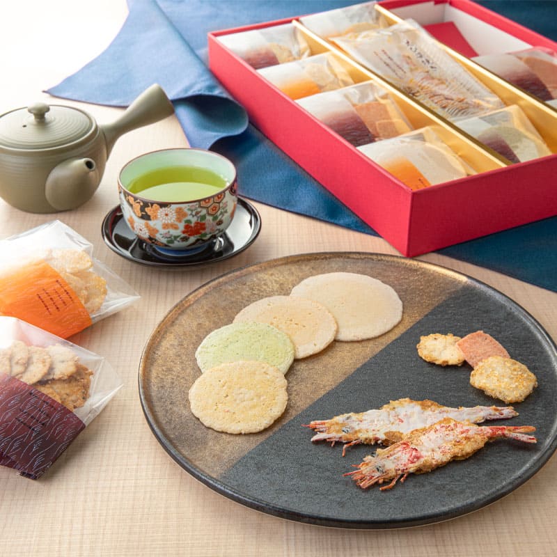 甘海老姿焼きを主役に、のり、いかなど、海鮮の風味がさざ波のように打ち寄せる7種類の多彩な味わいの煎餅詰合せです。