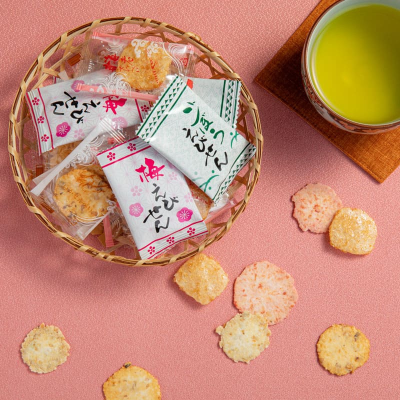 | 商品内容 | ごぼう海老煎餅、梅海老煎餅、いかつぶ煎餅、ざらめ海老煎餅 |
