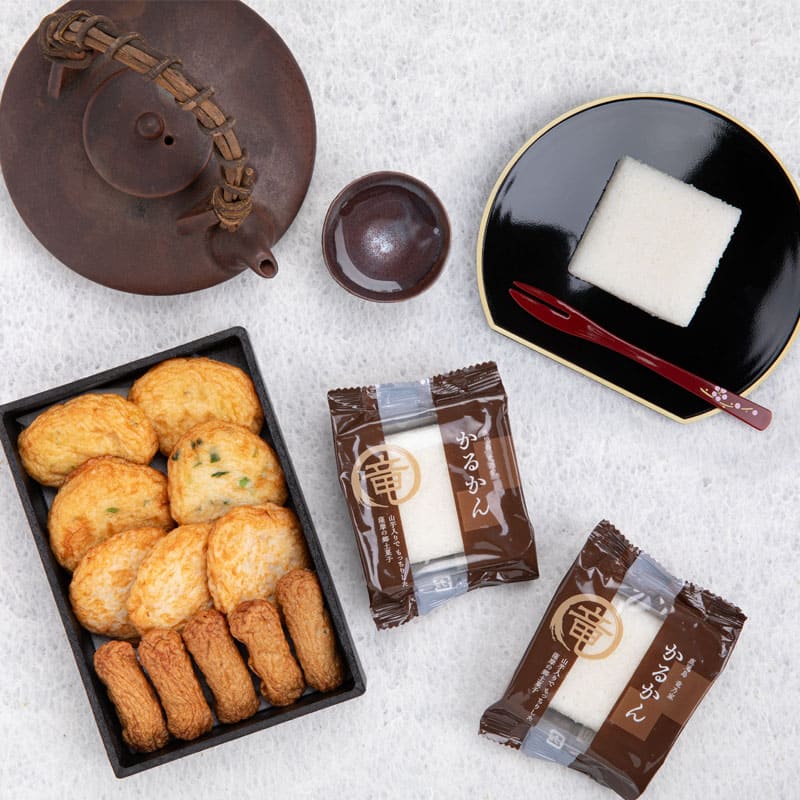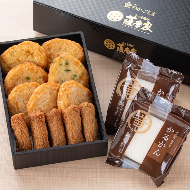 | 原材料名 | 【薩摩揚】 魚肉(外国製造又は国内製造)、蓮根水煮、植物油、牛蒡水煮、砂糖、発酵調味料、卵白、加糖卵黄、還元水飴、食塩、ニラ、ブドウ糖、粉末状大豆たん白、魚醤、魚介エキス、蜂蜜/加工デンプン、調味料(アミノ酸等)、pH調整剤、増粘剤(サイリウムシードガム)、セルロース、V.C、焼成Ca、(一部に小麦・卵・大豆を含む) 【かるかん】 砂糖(国内製造)、米粉(国内製造)、山芋/トレハロース |